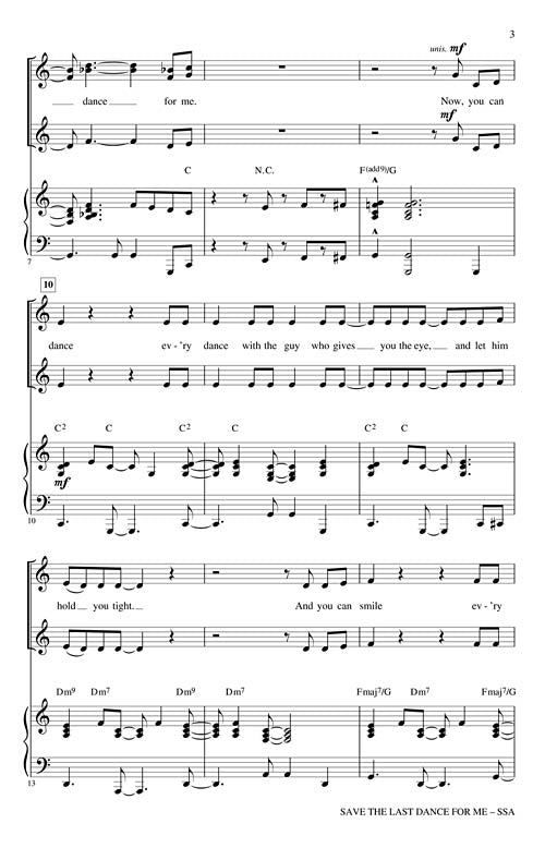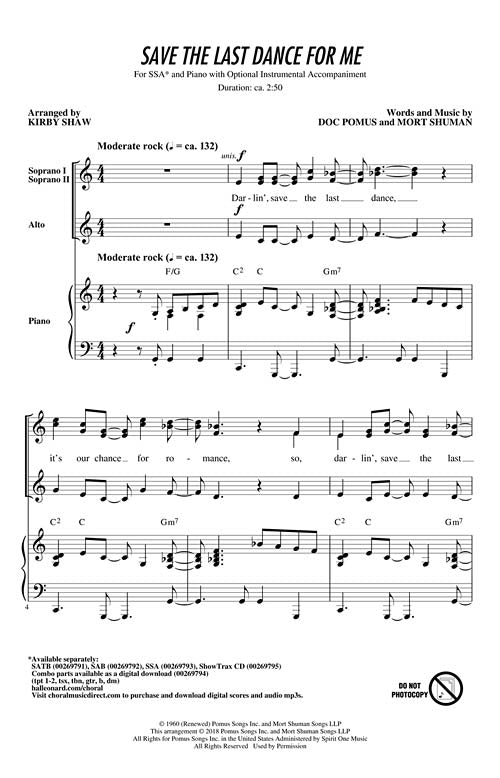 Save the Last Dance for Me Composer: Doc Pomus arr. Kirby Shaw Publisher: Category: Choral Series: Jazz Chorals Format: Octavo Voicing: SSA Here is a jazzy take on a classic pop/rock tune. The original version, sung...Regular price $26.99 -