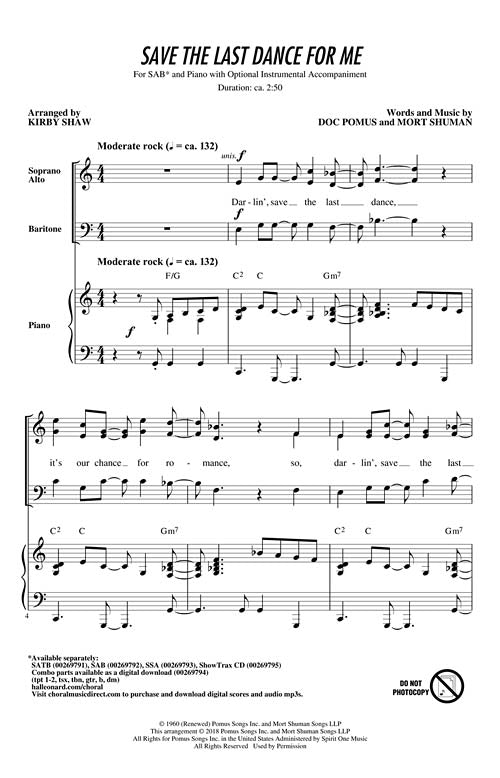 Save the Last Dance for Me Artist: Doc Pomus arr. Kirby Shaw Publisher: Category: Choral Series: Jazz Chorals Format: Octavo Voicing: SAB Here is a jazzy take on a classic pop/rock tune. The original version, sung...Regular price $26.99 -