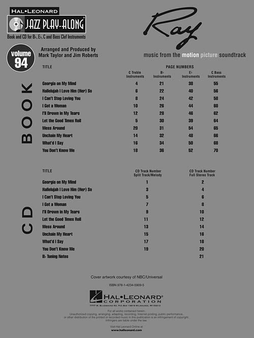 Artist: Ray Charles Ray Jazz Play-Along Volume 94 Publisher: Hal Leonard Category: Band/Orchestra/Ensemble Series: Jazz Play Along Format: Softcover with CD For use with all Bb, Eb, C, and bass clef instruments, the JAZZ PLAY ALONG...Regular price $23.99 -