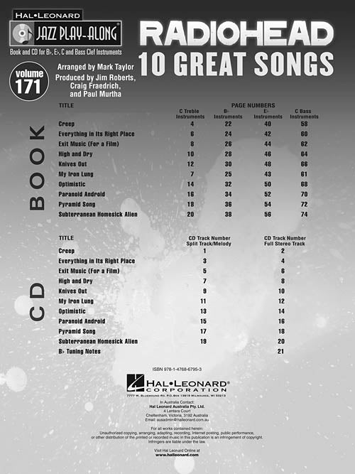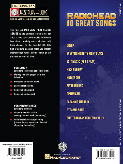 Artist: Radiohead Radiohead Jazz Play-Along Volume 171 Softcover with CD For use with all B-flat, E-flat, Bass Clef and C instruments, the Jazz Play-Along Series is the ultimate learning tool for all jazz musicians. With musician-friendly...Regular price $20.99 -