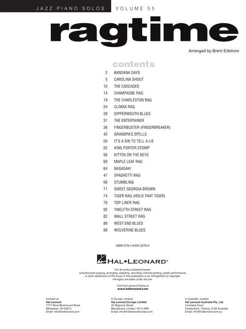 Composer: Various Ragtime Jazz Piano Solos Series Volume 55 Publisher: Hal Leonard Category: Keyboard & Piano/Vocal/Guitar Series: Jazz Piano Solos Format: Softcover This volume features 26 ragtime favorites in fresh new piano solo arrangements, including: Carolina...Regular price $20.99 -
