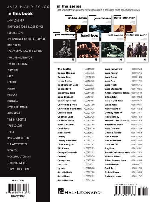 Composer: Various Pop Ballads Jazz Piano Solos Series Volume 56 Publisher: Hal Leonard Category: Keyboard & Piano/Vocal/Guitar Series: Jazz Piano Solos Format: Softcover 25 jazzy piano solo arrangements of pop ballads, including: And I Love Her...Regular price $27.99