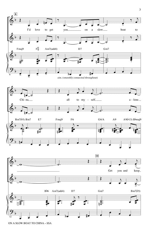On a Slow Boat to China SSA Set in a medium swing, this jazz standard cooks from start to finish! Opening with unison vocals, it moves to two-part, then four-part jazz chords over a steady walking...Regular price $23.99 -