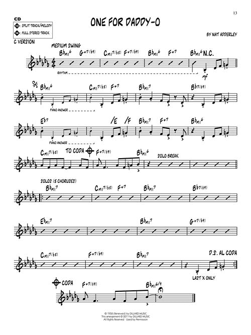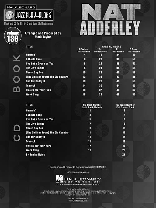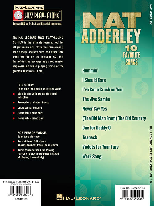 Artist: Nat Adderley Nat Adderley Jazz Play-Along Volume 136 Publisher: Hal Leonard Category: Solo Instrumental Series: Jazz Play Along Format: Softcover with CD For use with all B-flat, E-flat, Bass Clef and C instruments, the Jazz...Regular price $20.99