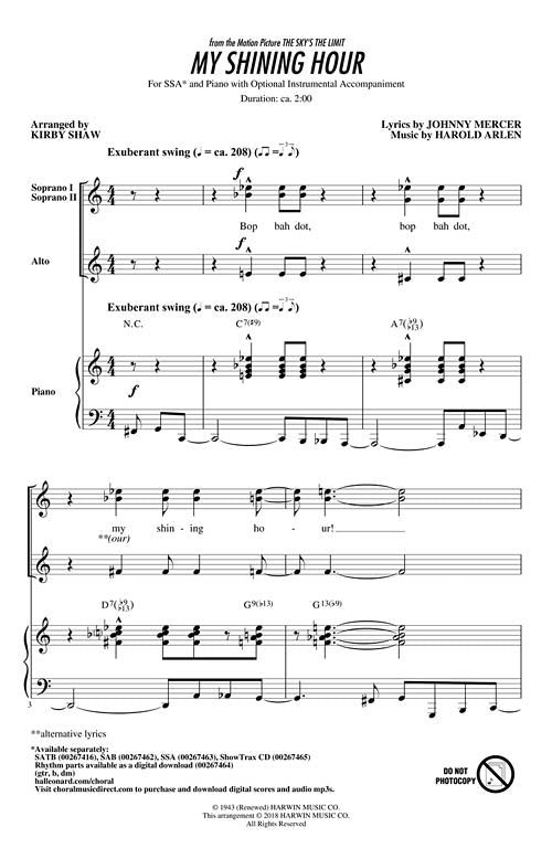 My Shining Hour Jazz Chorals Ssa Harold Arlen