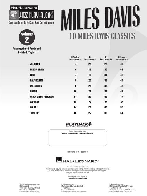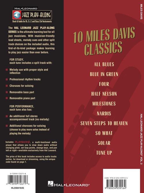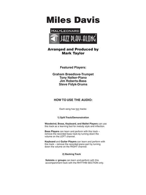 Composer: Miles Davis Miles Davis Jazz Play-Along Volume 2 Publisher: Hal Leonard Category: Solo Instrumental Series: Jazz Play Along Format: Softcover Audio Online For use with all Bb, Eb, and C instruments, the JAZZ PLAY ALONG...Regular price $23.99 -