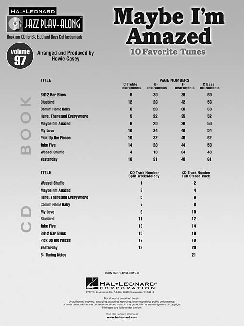 Composer: Various Maybe I'm Amazed Jazz Play-Along Volume 97 Publisher: Hal Leonard Category: Band/Orchestra/Ensemble Series: Jazz Play Along Format: Softcover with CD For use with all Bb, Eb C and Bass Clef instruments, the Hal Leoanrd...Regular price $20.99 -
