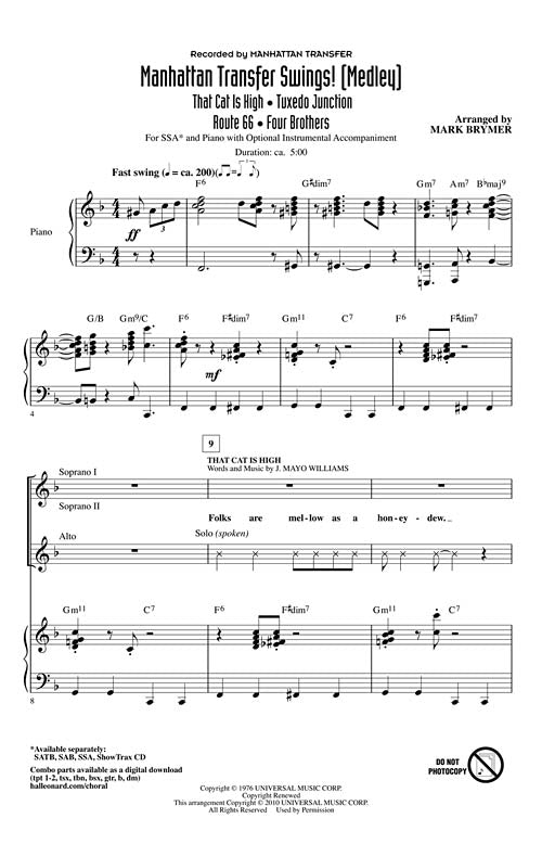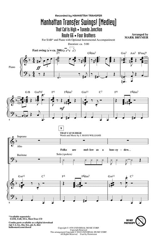 Manhattan Transfer Swings! (Medley) Composer: Mark Brymer arr. Mark Brymer Publisher: Category: Choral Series: Jazz Chorals Format: Voicing: SAB Four of Manhattan Transfer's signature songs are showcased here in a 6-minute mini-medley that will totally energize...Regular price $35.99 -