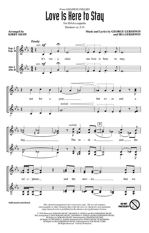 Love Is Here to Stay Octavo Now available in an SSAA voicing, this Gershwin ballad is expertly arranged in a rich unaccompanied setting. Fantastic for developing style, blend and technique! Inventory # : 00156870 UPC: 888680608484...Regular price $23.99