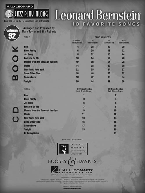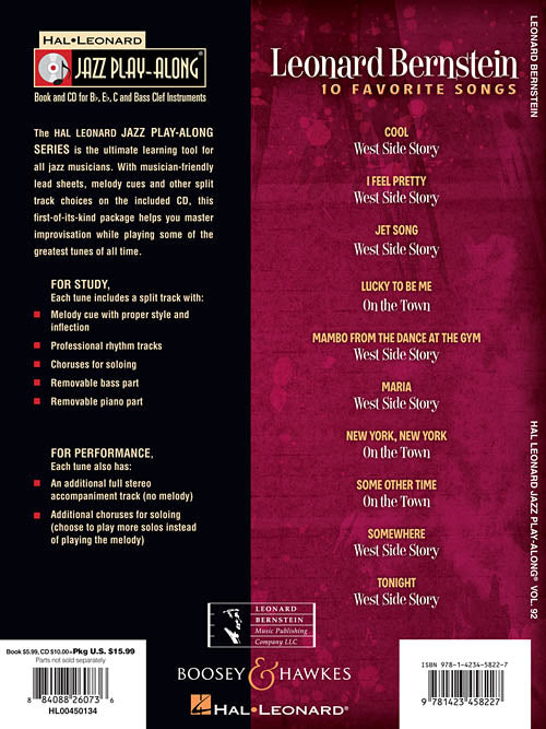 Composer: Leonard Bernstein Leonard Bernstein Jazz Play-Along Volume 92 Publisher: Hal Leonard Category: Solo Instrumental Series: Jazz Play Along Format: Softcover with CD For use with all Bb, Eb, C and bass clef instruments, the Jazz...Regular price $20.99 -