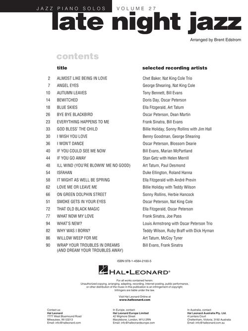 Composer: Various Late Night Jazz Jazz Piano Solos Series Volume 27 Publisher: Hal Leonard Category: Keyboard & Piano/Vocal/Guitar Series: Jazz Piano Solos Format: Softcover Piano solo arrangements of 24 jazz favorites, including: Almost like Being in...Regular price $23.99 -