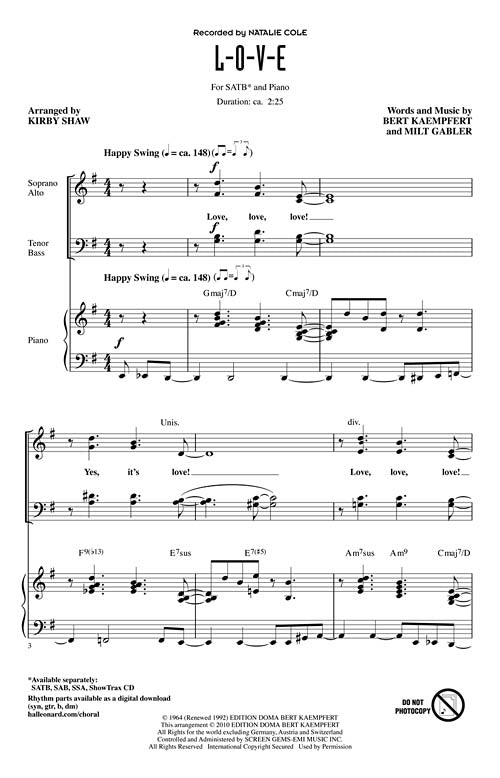 L-O-V-E Arranger: Bert Kaempfert, Milt Gabler arr. Kirby Shaw Publisher: Category: Choral Series: Jazz Chorals Format: Voicing: SSA No matter how you spell it, your vocal jazz group will love to perform this happy swing setting...Regular price $29.99 -