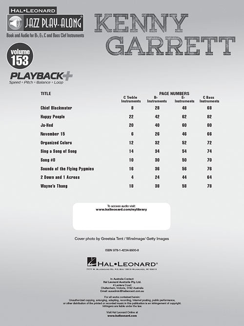 Artist: Kenny Garrett Kenny Garrett Jazz Play-Along Volume 153 Publisher: Hal Leonard Category: Keyboard & Piano/Vocal/Guitar Series: Jazz Play Along Format: Softcover Audio Online For use with all B-flat, E-flat, Bass Clef, and C instruments, the...Regular price $29.99 -