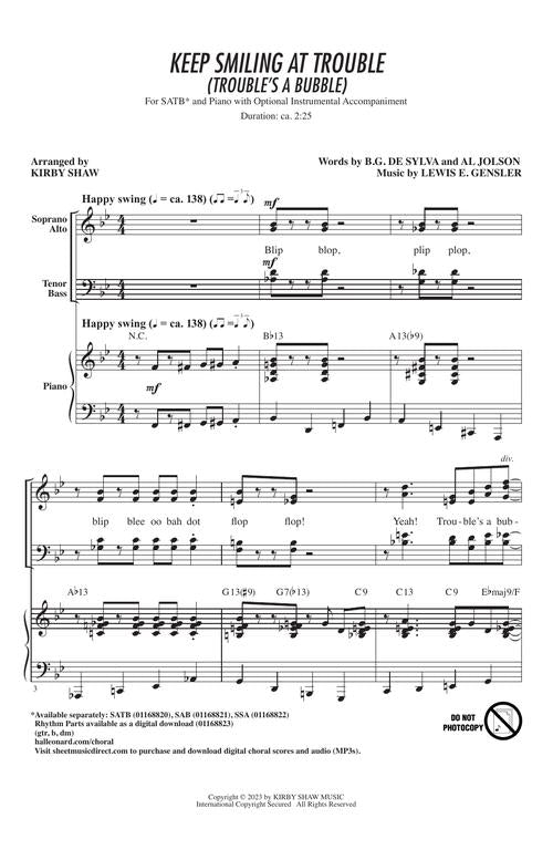 Keep Smiling at Trouble (Trouble's a Bubble) Publisher: Hal Leonard Category: Choral Series: Jazz Chorals Format: Octavo An old-fashioned song with an ageless text, this Lewis Gensler original-- notably covered by Al Jolson and Tony Bennett--...Regular price $26.99 -