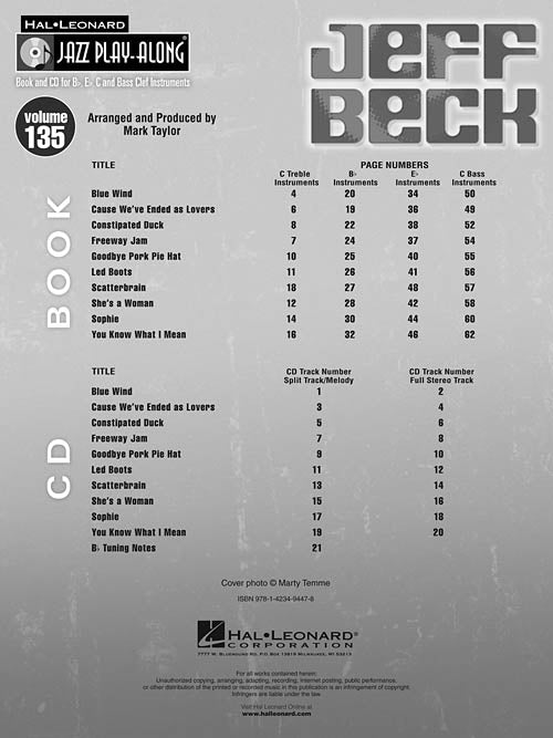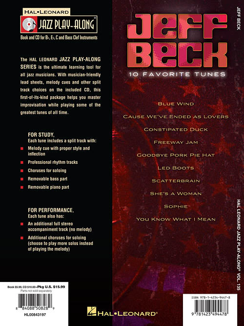 Artist: Jeff Beck Jeff Beck Jazz Play-Along Volume 135 Publisher: Hal Leonard Category: Solo Instrumental Series: Jazz Play Along Format: Softcover with CD For use with all B-flat, E-flat, Bass Clef and C instruments, the Jazz...Regular price $20.99