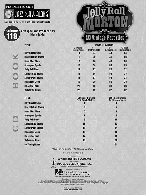 Artist: Jelly Roll Morton Jelly Roll Morton Jazz Play-Along Volume 119 Publisher: Hal Leonard Category: Solo Instrumental Series: Jazz Play Along Format: Softcover with CD For use with all B-flat, E-flat, Bass Clef and C instruments,...Regular price $20.99 -