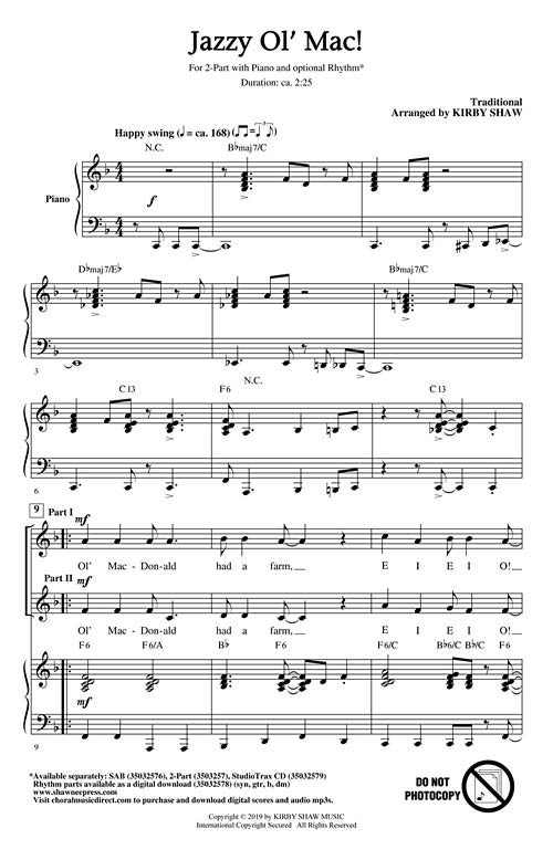 Jazzy Ol' Mac! Arranger: Kirby Shaw arr. Kirby Shaw Publisher: Shawnee Press Category: Choral Series: Shawnee Press Format: Octavo Voicing: 2-Part Old MacDonald takes on a jazzy feel for young and developing choirs in this Shaw...Regular price $25.99 -