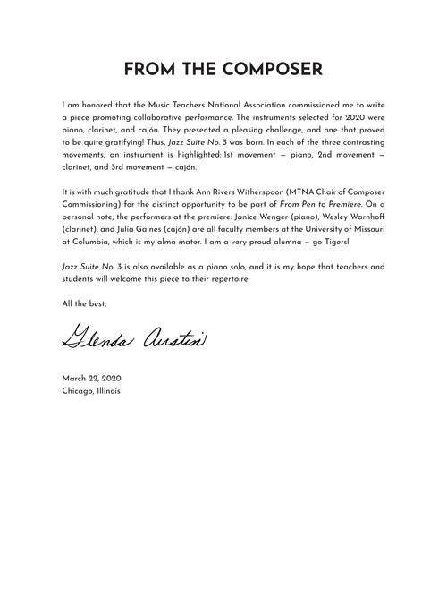 Jazz Suite No. 3 for Clarinet, Cajon, and Piano Publisher: Willis Music Category: Band/Orchestra/Ensemble Series: Willis Format: Softcover Commissioned by MTNA to be premiered at the 2020 National Conference in Chicago, this upbeat work features a...Regular price $20.99 -