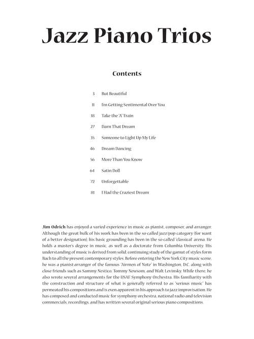E: Jim Odrich Jazz Piano Trios Music Minus One Piano Publisher: Music Minus One Category: Keyboard & Piano/Vocal/Guitar Series: Music Minus One Format: Softcover Audio Online Piano master Jim Odrich has compiled a great collection of...Regular price $23.99