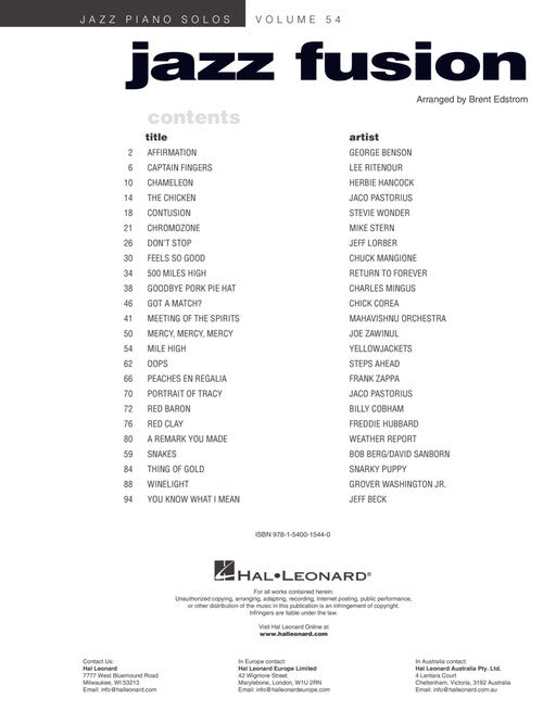 Composer: Various Jazz Fusion Jazz Piano Solos Series Volume 54 Publisher: Hal Leonard Category: Keyboard & Piano/Vocal/Guitar Series: Jazz Piano Solos Format: Softcover 24 fusion favorites are included in this collection featuring piano solo arrangements with...Regular price $20.99 -