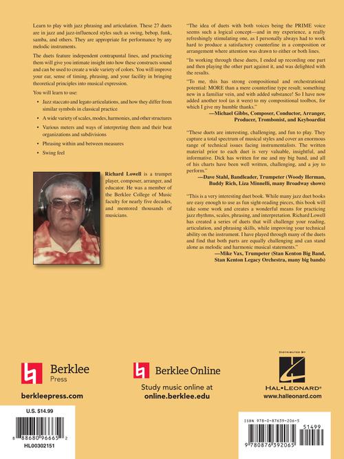 Author: Richard Lowell Jazz Duets Etudes for Phrasing and Articulation Publisher: Berklee Press Category: Solo Instrumental Series: Berklee Guide Format: Softcover Learn to play with jazz phrasing and articulation. These 27 duets are in jazz and...Regular price $17.99 -