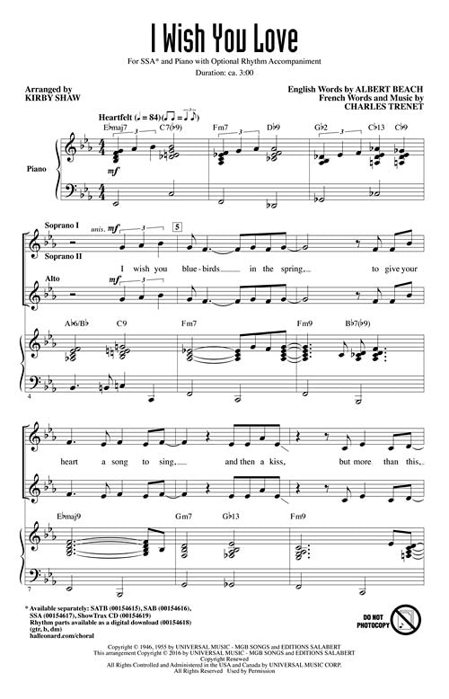 I Wish You Love Jazz Chorals Sab Albert Beach