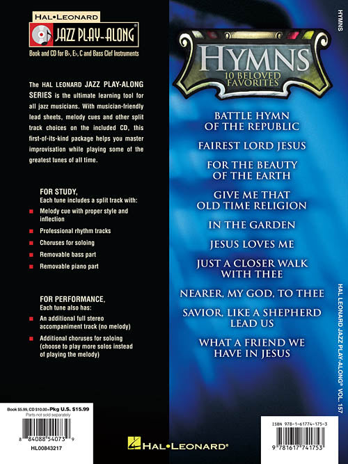 Composer: Various Hymns Jazz Play-Along Volume 157 Publisher: Hal Leonard Category: Solo Instrumental Series: Jazz Play Along Format: Softcover with CD For use with all B-flat, E-flat, C and Bass clef instruments, the Jazz Play-Along Series...Regular price $20.99 -