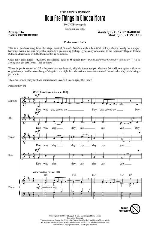 How Are Things in Glocca Morra (from Finian's Rainbow) SATB a cappella This is a fabulous song from the stage musical Finian's Rainbow with a beautiful melody shaped totally in a major harmony, with a melodic...Regular price $23.99 -