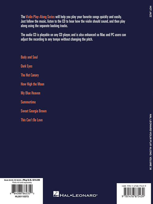 Hot Jazz Violin Play-Along Volume 36 Publisher: Hal Leonard Category: Guitar, Bass & Fretted Series: Violin Play-Along Format: Softcover with CD The Violin Play-Along series will help you play your favorite songs quickly and easily. Just...Regular price $17.99 -