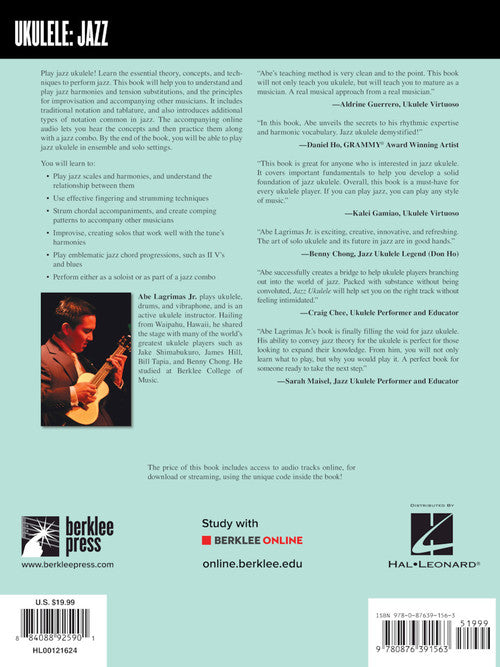 Author: Abe Lagrimas, Jr. Jazz Ukulele Comping, Soloing, Chord Melodies Softcover Audio Online Play jazz ukulele! Learn the essential theory, concepts, and techniques to perform jazz. This book will help you to understand and play jazz...Regular price $32.99