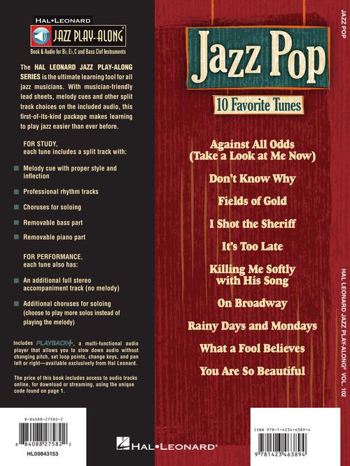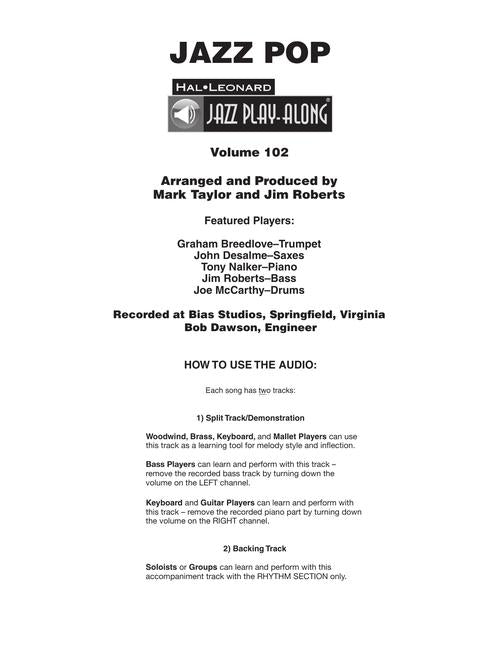 Composer: Various Jazz Pop Jazz Play-Along Volume 102 Publisher: Hal Leonard Category: Solo Instrumental Series: Jazz Play Along Format: Softcover with CD For use with all Bb, Eb, C and BC instruments, the Jazz Play-Along Series...Regular price $23.99 -