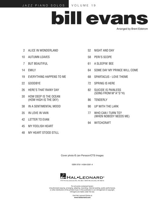 Artist: Bill Evans Bill Evans Jazz Piano Solos Series Volume 19 Publisher: Hal Leonard Category: Keyboard & Piano/Vocal/Guitar Series: Jazz Piano Solos Format: Softcover 24 essential Evans standards arranged for piano solo, including: Alice in Wonderland...Regular price $27.99 -