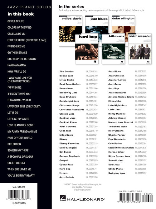 Composer: VariousDisney FavoritesJazz Piano Solos Series Volume 51Publisher: Hal LeonardCategory: Keyboard & Piano/Vocal/GuitarSeries: Jazz Piano SolosFormat: Softcover25 Disney classics in jazz-flavored piano solo arrangments with chord names, including: Cruella De Vil · Friend like Me ·...Regular price $26.99