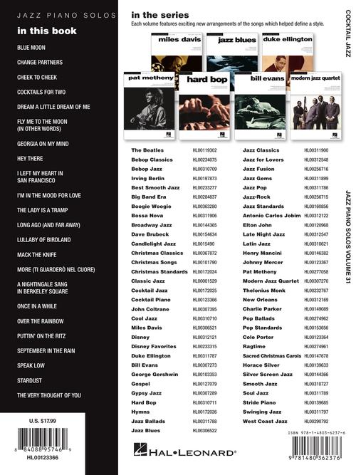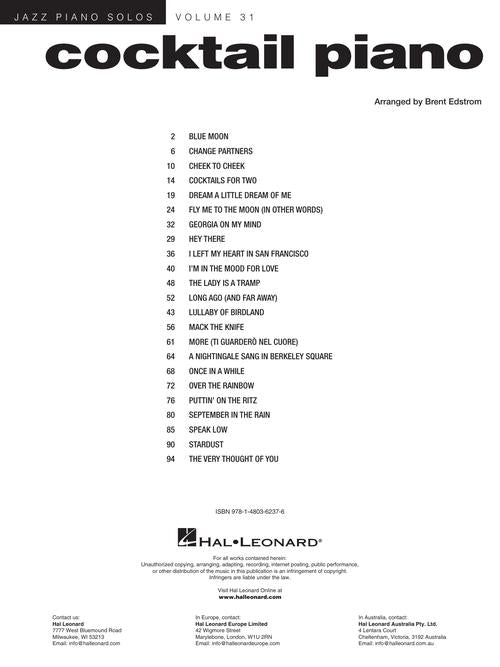 Cocktail PianoJazz Piano Solos Series Volume 31Publisher: Hal LeonardCategory: Keyboard & Piano/Vocal/GuitarSeries: Jazz Piano SolosFormat: SoftcoverCool, jazzy arrangements of 23 most-requested standards at the piano lounge, including: Blue Moon · Cocktails for Two · Dream a...Regular price $23.99 -