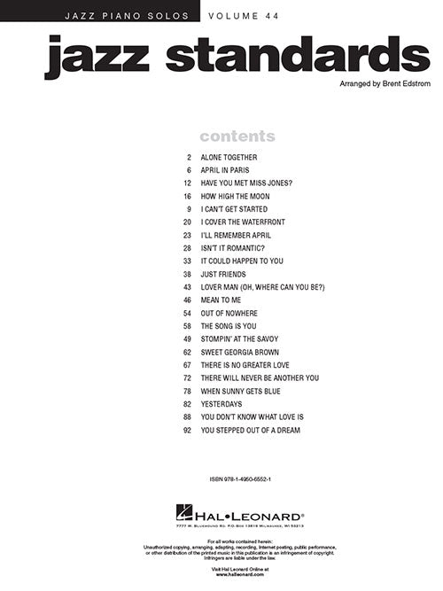 Composer: VariousJazz StandardsJazz Piano Solos Series Volume 44Softcover22 classic jazz favorites in piano solo arrangements, including chord names. Songs include: April in Paris · How High the Moon · I Can't Get Started · Just Friends...Regular price $23.99 -