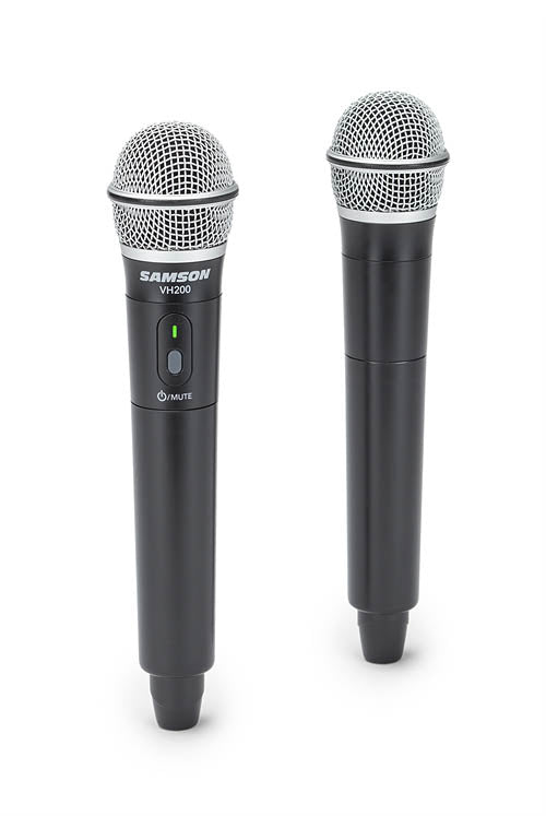 Samson's Stage 200 is a dual-channel wireless microphone system that provides two handheld dynamic microphones that transmit to a single rugged metal receiver. Each handheld features Samson's Q6 mic element, providing crisp, clear sound and reliable VHF wireless performance for home karaoke, live presentation, education, house of worship and other dual-performer applications. The Stage 200 operates in the reliable VHF frequency spectrum, which has become significantly less crowded with the advancement of digital TV. VHF operation also provides both mic transmitters with an exceptional battery life of up to 12 hours via two AA batteries (not included). Featuring the rugged metal SR200 receiver, the Stage 200 is designed for maximum durability and versatility. Its back panel provides two 1/4 inch. outputs, as well as a balanced XLR out, to connect to a dedicated mixer or powered PA speaker. The 1/4 inch. outputs send each channel separately, while the XLR sends a mix of both. Front panel volume controls on each channel let you find the perfect blend between two performers. Samson has been dedicated to driving wireless innovation, always striving to make it easier for performers everywhere to cut the chord. The Stage 200's fixed frequency operation provides instant setup. Simply plug in the receiver and turn on your transmitters to experience quality wireless performance. A 200' operating range provides ample freedom for any presenter or performer duo.