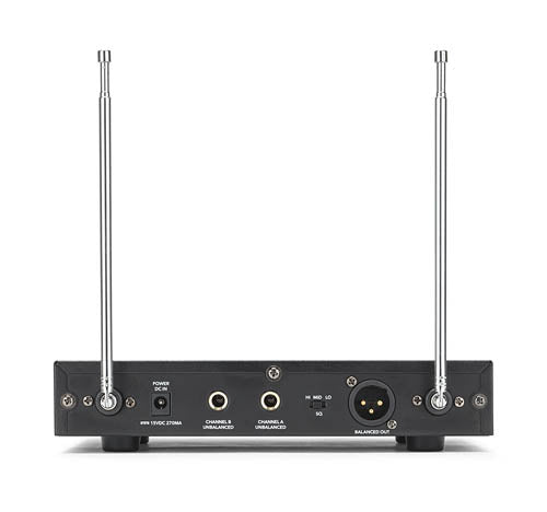 Samson's Stage 200 is a dual-channel wireless microphone system that provides two handheld dynamic microphones that transmit to a single rugged metal receiver. Each handheld features Samson's Q6 mic element, providing crisp, clear sound and reliable VHF wireless performance for home karaoke, live presentation, education, house of worship and other dual-performer applications. The Stage 200 operates in the reliable VHF frequency spectrum, which has become significantly less crowded with the advancement of digital TV. VHF operation also provides both mic transmitters with an exceptional battery life of up to 12 hours via two AA batteries (not included). Featuring the rugged metal SR200 receiver, the Stage 200 is designed for maximum durability and versatility. Its back panel provides two 1/4 inch. outputs, as well as a balanced XLR out, to connect to a dedicated mixer or powered PA speaker. The 1/4 inch. outputs send each channel separately, while the XLR sends a mix of both. Front panel volume controls on each channel let you find the perfect blend between two performers. Samson has been dedicated to driving wireless innovation, always striving to make it easier for performers everywhere to cut the chord. The Stage 200's fixed frequency operation provides instant setup. Simply plug in the receiver and turn on your transmitters to experience quality wireless performance. A 200' operating range provides ample freedom for any presenter or performer duo.
