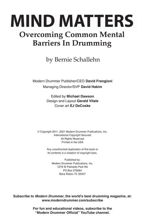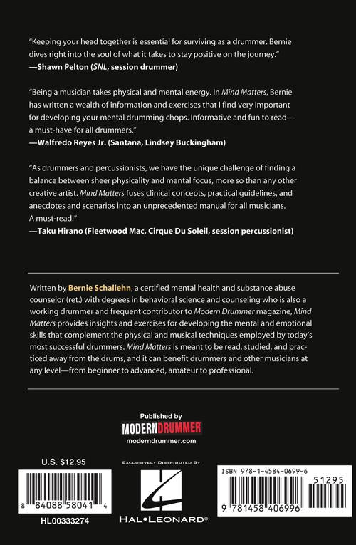 Mind Matters Overcoming Common Mental Barriers in Drumming A User's Manual for the Mind Publisher: Modern Drummer Publications Category: Drums & Percussion Series: Book Format: Softcover Written by Bernie Schallehn, a certified mental health and substance...Regular price $15.99