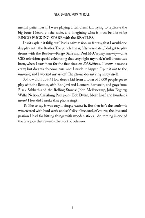 Sex, Drums, Rock 'n' Roll! The Hardest Hitting Man in Show Business Hardcover Foreword by Neil Peart. Talent, energy, dedication, discipline, passion, innovation, education, drive, mind, body, spirit, vision, honor, truth, and drums make the man:...Regular price $35.99 -