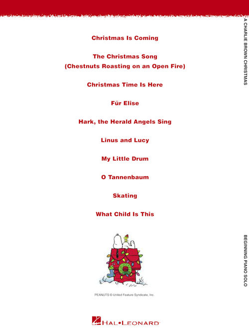 Piano solo arrangements for beginners of all ten Vince Guaraldi songs from this beloved annual classic: Christmas Is Coming · The Christmas Song · Christmas Time Is Here · Für Elise · Hark, the Herald Angels Sing · Linus and Lucy · My Little Drum · O Tannenbaum · Skating · What Child Is This?.