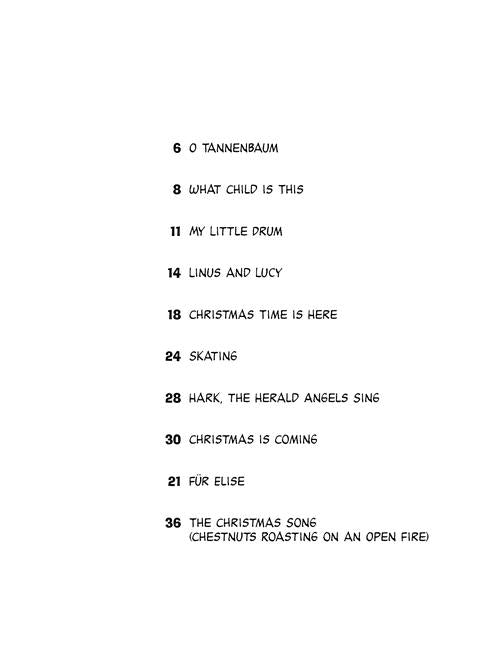 This beloved holiday classic is eagerly anticipated every season by kids of all ages! This songbook features all 10 great Vince Guaraldi tunes from the soundtrack: Christmas Is Coming · The Christmas Song (Chestnuts Roasting on an Open Fire) · Christmas Time Is Here · Für Elise · Hark, the Herald Angels Sing · Linus and Lucy · My Little Drum · O Tannenbaum · Skating · What Child Is This. Also includes pages of B&W Peanuts(TM) line art.