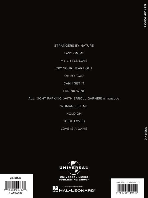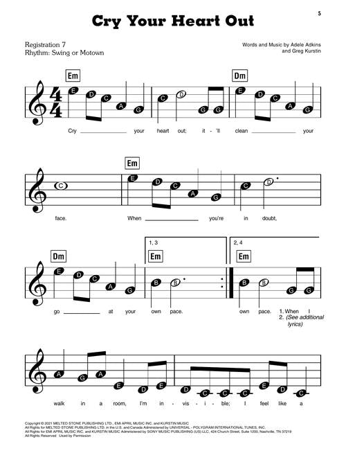 This collection features all 12 songs on Adele's blockbuster release arranged at the easiest level: with note names printed inside the note heads, minimal page turns, registrations, and even lyrics! Songs include: Can I Get It · Easy on Me · Hold On · I Drink Wine · Oh My God · Woman like Me · and more.