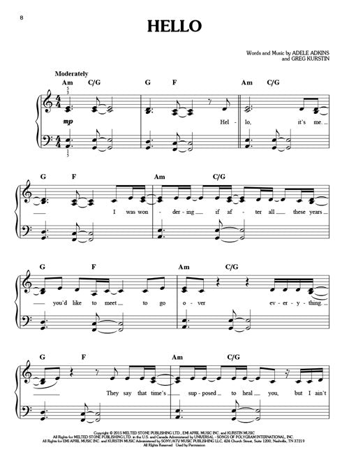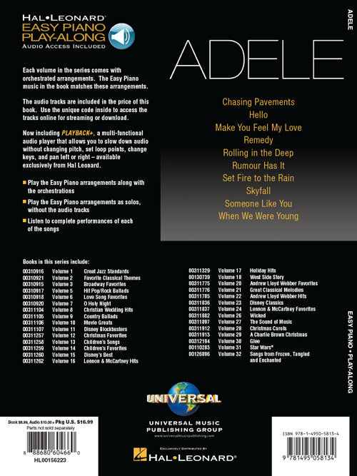 Each book in this series comes with recordings of complete professional performances, and includes matching custom arrangements in easy piano format. With these books you can: listen to the recordings of each song; play the easy piano arrangements along with the performances; sing along with the full performances; play the easy piano arrangements as solos, without the audio. This pack features 10 songs from the beloved British songstress, including: Chasing Pavements · Hello · Make You Feel My Love · Remedy · Rolling in the Deep · Rumour Has It · Set Fire to the Rain · Skyfall · Someone Like You · When We Were Young.