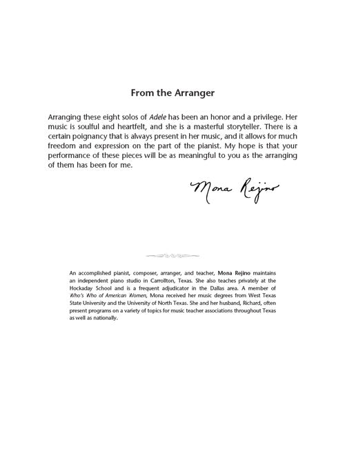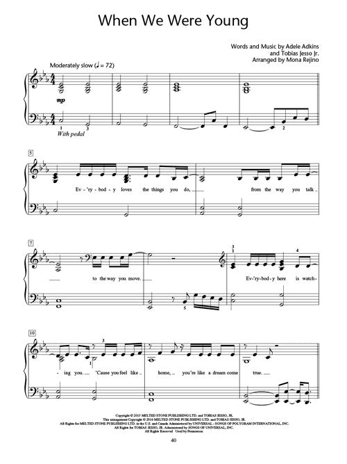 Eight beautiful arrangements of Adele's songs for the intermediate-level pianist. Titles: Hello · Make You Feel My Love · Million Years Ago · Rolling in the Deep · Someone Like You · Take It All · Turning Tables · When We Were Young.