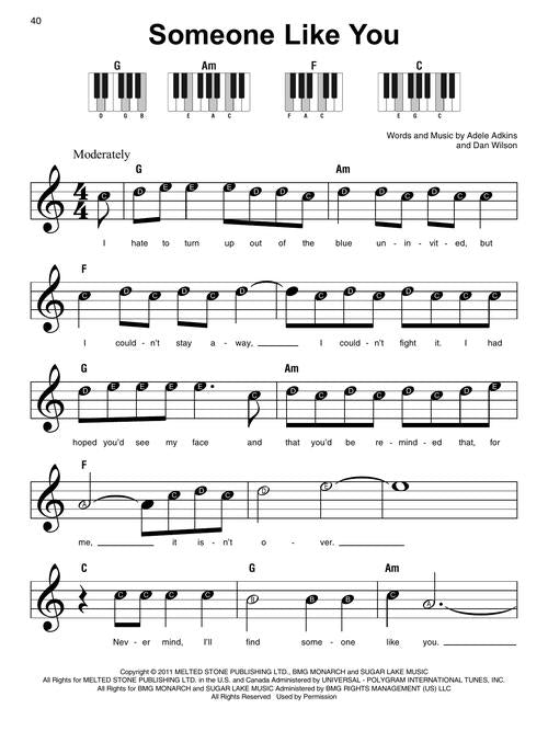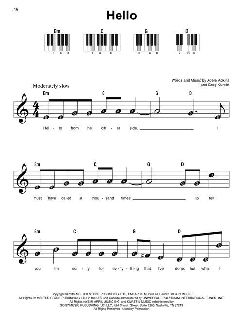 It's super easy! Hal Leonard Super Easy Songbooks feature arrangements with no page turns, simple right-hand melody, letter names inside each note, and basic left-hand chord diagrams. This volume features 22 of Adele's best, including: All I Ask · Chasing Pavements · Easy on Me · Hello · Make You Feel My Love · Oh My God · Rolling in the Deep · Send My Love (To Your New Lover) · Skyfall · Someone like You · and more!