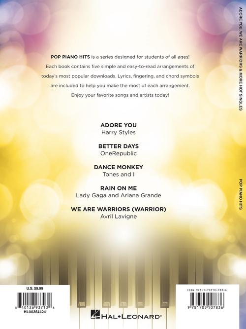 Pop Piano Hits is a series designed for students of all ages! Each book contains five simple and easy-to-read arrangements of today's most popular downloads. Lyrics, fingering and chord symbols are included to help you make the most of each arrangement. Enjoy your favorite songs and artists today! This edition contains: Adore You (Harry Styles) · Better Days (OneRepublic) · Dance Monkey (Tones and I) · Rain on Me (Lady Gaga and Ariana Grande) · We Are Warriors/Warrior (Avril Lavigne).