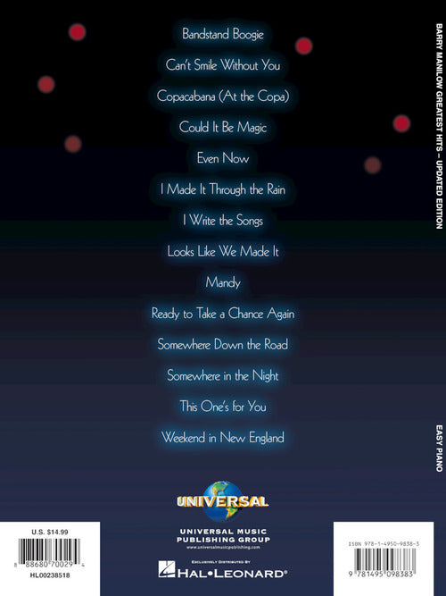 14 of the most popular songs from Manilow's long-lasting career are included in the 2nd edition of this easy piano collection. Songs include: Bandstand Boogie · Can't Smile Without You · Copacabana (At the Copa) · Could It Be Magic · Even Now · I Made It Through the Rain · I Write the Songs · Looks like We Made It · Mandy · Ready to Take a Chance Again · Somewhere Down the Road · Somewhere in the Night · This One's for You · Weekend in New England.