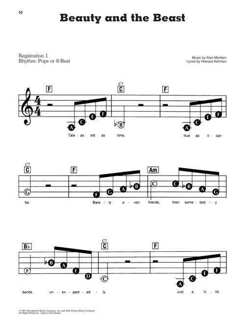 10 selections from the 2017 Disney motion picture soundtrack, arranged in our easy to read and play E-Z Play Today notation. Includes: Aria · Be Our Guest · Beauty and the Beast · Belle · Days in the Sun · Evermore · Gaston · How Does a Moment Last Forever · The Mob Song · Something There.
