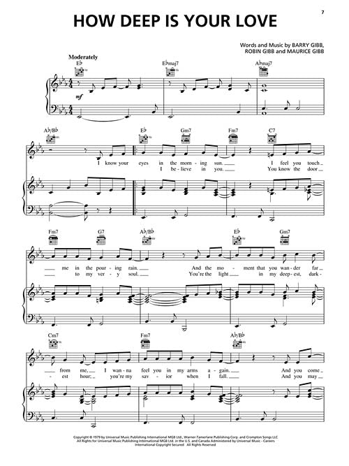 Your favorite sheet music will come to life with the innovative Piano Play-Along series! With these book/CD collections, piano and keyboard players will be able to practice and perform with professional-sounding accompaniments. Containing eight cream-of-the-crop songs each, the books feature new engravings, with a separate vocal staff, plus guitar frames, so players and their friends can sing or strum along. The CDs feature two tracks for each tune: a full performance for listening, and a separate backing track that lets players take the lead on keyboard. The high-quality, sound-alike accompaniments exactly match the printed music. 8 big Bee Gees hits: How Can You Mend a Broken Heart · How Deep Is Your Love · I Started a Joke · Jive Talkin' · Night Fever · Nights on Broadway · Stayin' Alive · You Should Be Dancing.