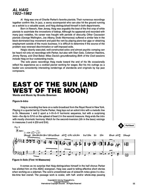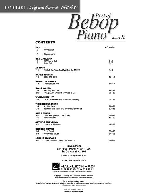 Learn the trademark piano styles and techniques of bebop pioneers such as Red Garland, Hampton Hawes, Hank Jones, George Shearing and others! Through transcriptions and recorded examples, Gene Rizzo teaches 16 classic tunes: April in Paris · Body and Soul · Cherokee · East of the Sun (And West of the Moon) · I Don't Stand a Ghost of a Chance · If I Were a Bell · Lullaby of Birdland · On a Clear Day · Prelude to a Kiss · Satin Doll · Thou Swell · and more.